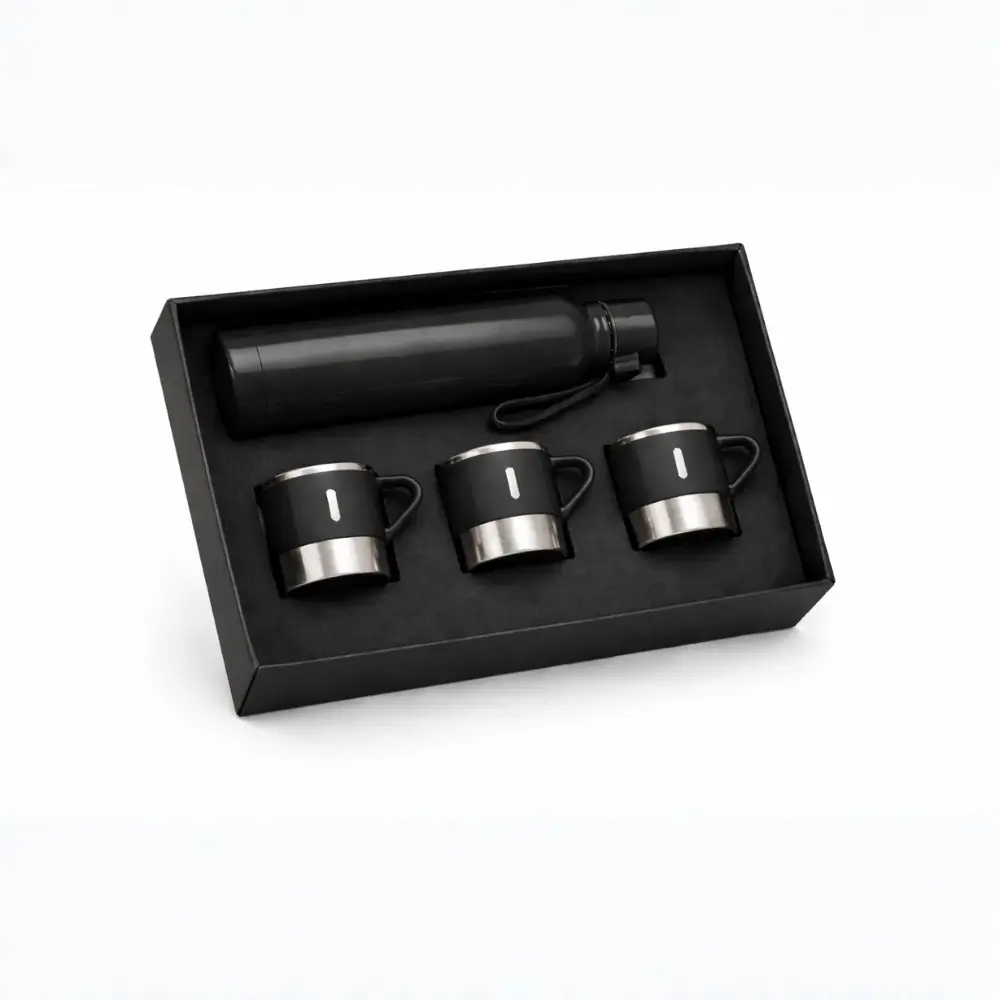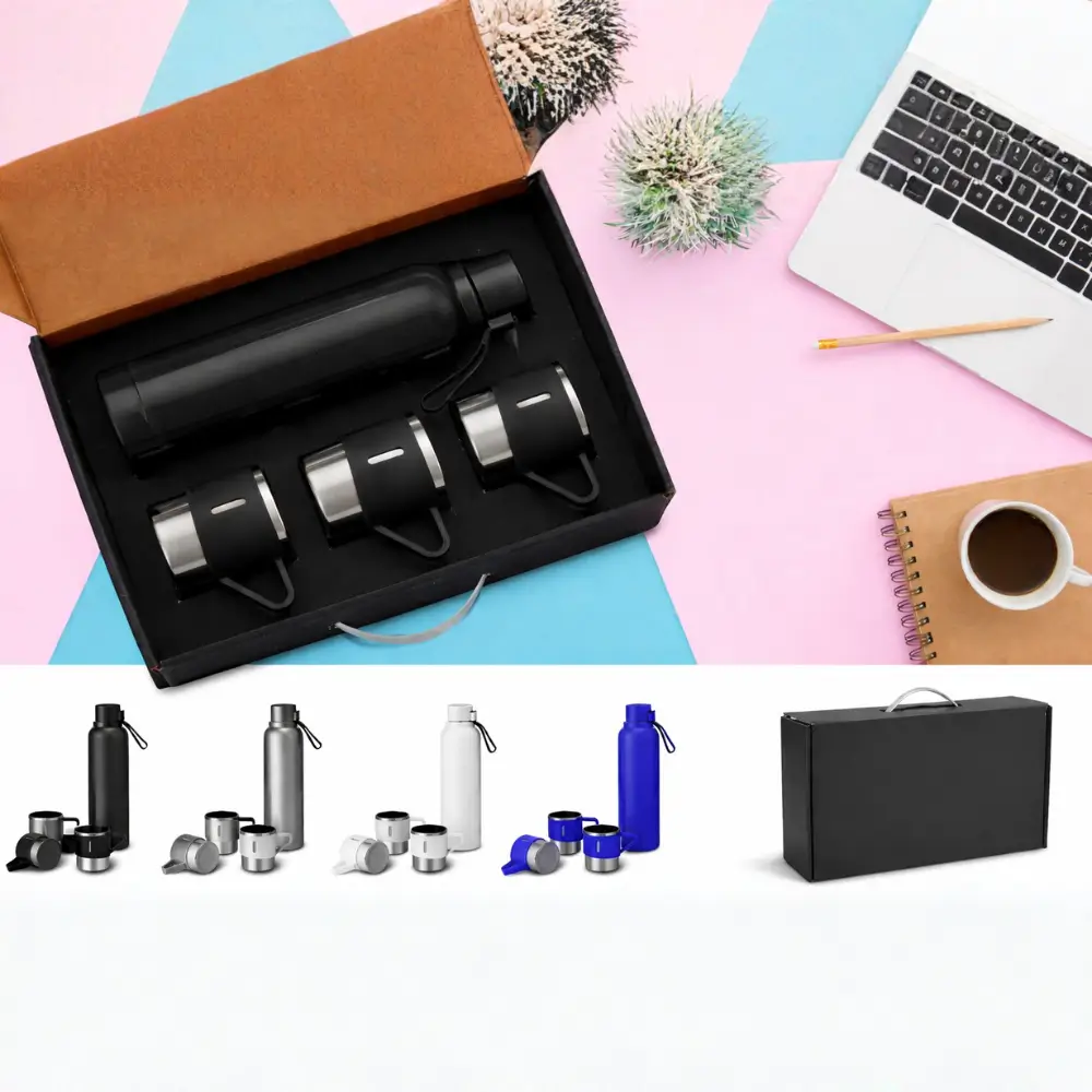 Stainless steel bottle Black insulated water bottle with three matching black cups on a white background Stainless Steel Bottle 4-Piece...