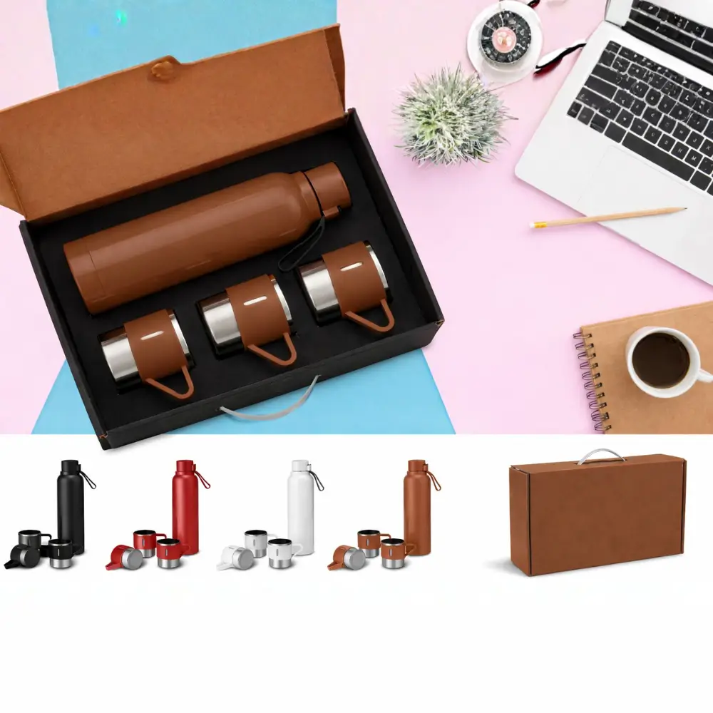 Brown insulated Travel drinkware set with three matching Brown cups in a gift box Travel drinkware set 4-Piece I...